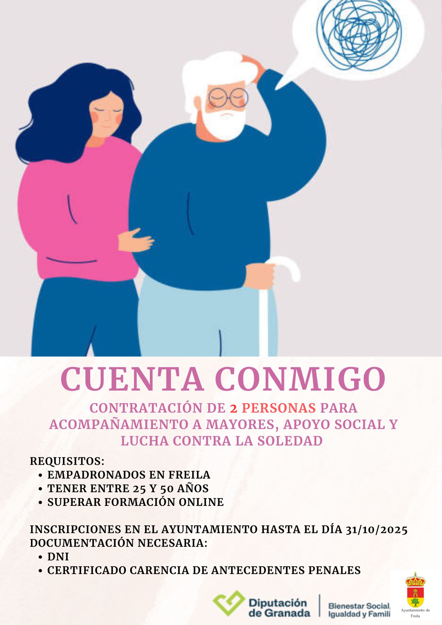 Desde el Ayuntamiento de Freila y la Diputación de Granada se abre la contratación de 2 personas para acompañar a mayores, ofrecer apoyo social y luchar contra la soledad.