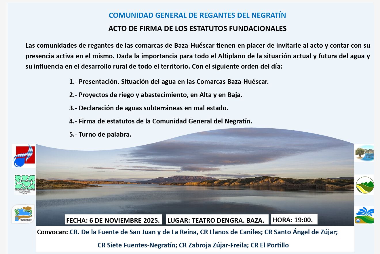 El Ayuntamiento informa que el próximo jueves 6 de noviembre de 2025, a las 19:00 horas, se celebrará en el Teatro Dengra de Baza el acto de firma de los estatutos fundacionales de la Comunidad General de Regantes del Negratín, en el que están convocadas todas las comunidades de regantes de las comarcas Baza-Huéscar.