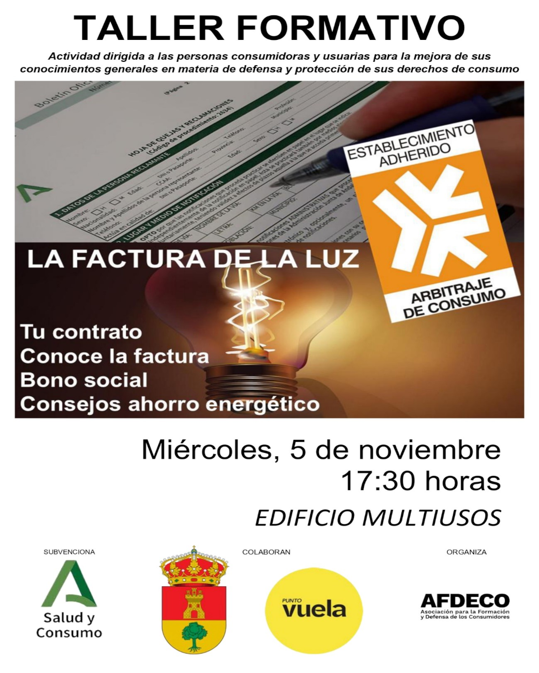 El próximo miércoles 5 de noviembre a las 17:30 horas, el Ayuntamiento organiza un taller práctico e informativo sobre la factura de la luz y el Bono Social, dirigido a todas las personas interesadas en comprender mejor su consumo eléctrico y las posibilidades de ahorro.